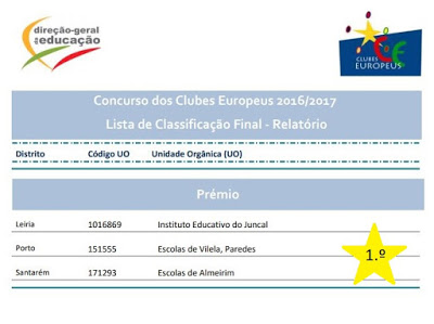 “Desde já os nossos parabéns aos premiados e um especial agradecimento a todos aqueles que participaram, enriquecendo assim o nosso trabalho” Esta foi a mensagem que o Clube Europeu do AE Almeirim recebeu da DGE pela classificação em primeiro lugar, com o trabalho desenvolvido no projeto “Para uma Europa de valores”. Parabéns aos alunos e professores!